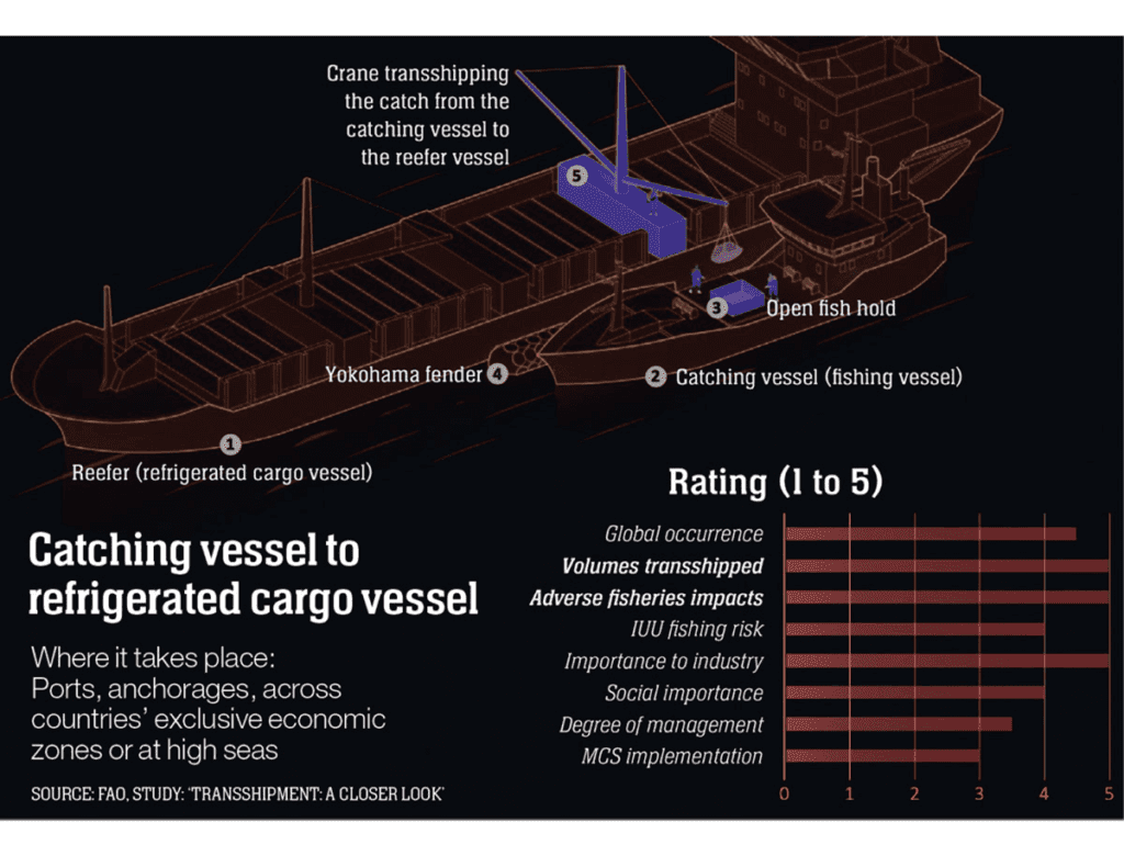 Le transfert de poissons capturés de petits bateaux de pêche vers de plus grands transporteurs réfrigérés ou « reefers » peut sembler anodin. Pourtant, lorsqu’elle n’est pas surveillée et non réglementée, elle peut contribuer à la perte de biodiversité, à la surpêche, à la fraude des produits de la mer et aux violations des droits de l’homme telles que le travail forcé, la traite des êtres humains, la migration et la piraterie.