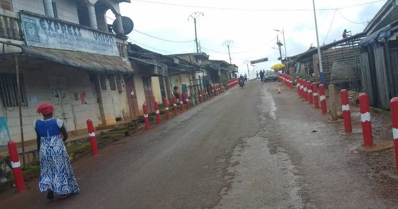‘Bruits de pelles et truelles’ dans le mortier sur le site de construction du ‘centre commercial(?),’ ‘coups de pinceaux’ sur les balises routières. ‘Sons sourds des marteaux-piqueurs’ au ‘Rond-point’ à l’entrée du marché. ‘Panneaux signalétiques routiers’ férocement enfoncés sur le bas-côté. Bazou est en chantier(?)!.